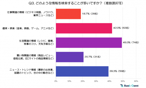 最も多かった回答は「生活関連の情報(レシピ、健康、家事のコツ、天気予報など)」の49.3%でした。60代の方々は日常生活をより便利に、あるいは快適にするための情報を積極的に検索している様子がうかがえます。
