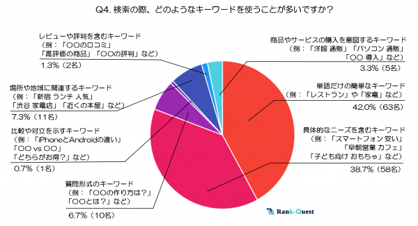 最も多かった回答は「単語だけの簡単なキーワード(例:『レストラン』『家電』など)」の42%でした。60代の方々は、まずはシンプルな単語で手早く検索する傾向があると言えます。