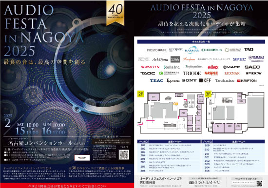 「AUDIO FESTA IN NAGOYA 2025」は1984年の開催以来、今回で40年を迎える事となりました。国内オーディオメーカー、海外輸入機器オーディオメーカーの最高級機器が一堂に集結する催事として、皆様の期待を担っております。次世代オーディオの世界を垣間見る絶好の機会であり、オーディオファンへ最新最高の情報を提供します。