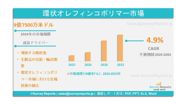 サーベイレポート合同会社は、環状オレフィンコポリマー市場の予測評価を提供する、グレード別(樹脂、フィルム)、処理別(コロナ、プラズマ、照射)、加工技術別(射出成形、キャスト&ブローフィルム押出、ブロー成形)、エンドユーザー産業別(パッケージング、ヘルスケア、光学、エレクトロニクス、診断、その他)-世界市場分析、動向、機会、予測、2024-2033年の調査レポート「環状オレフィンコポリマー市場」を2025年1月に発行したと発表しました。環状オレフィンコポリマー市場の成長促進要因、市場機会、課題、脅威など、いくつかの主要な市場ダイナミクスを紹介しています。