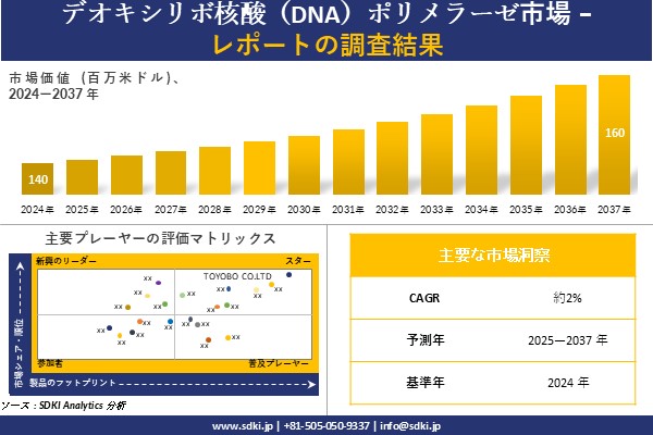 SDKI Analytics(本社:東京都渋谷区)は、このたび、2025年01月25に「デオキシリボ核酸(DNA)ポリメラーゼ市場調査レポート:2025−2037年の市場規模、シェア、傾向の予測」を発表しました。デオキシリボ核酸(DNA)ポリメラーゼに関する市場調査レポートには、統計的および分析的アプローチを使用した予測評価が含まれています。この調査レポートでは、一次および二次調査方法を使用して分析された主要な業界洞察を通じて将来の傾向を理解できるようにすることで、主要な市場動向を読者に説明しています。