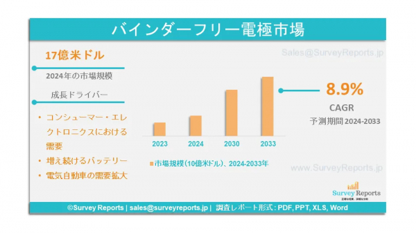 サーベイレポート合同会社は、2025年1月に調査レポート「バインダーフリー電極市場 タイプ別(負極、正極)、タイプ別(カーボンフォーム、グラフェン、グラファイト、カーボンファイバー、ゲルマニウム、その他)、プロセス別(化学、物理、電気)」を発表しました; 用途別(リチウムイオン電池、ナトリウムイオン電池、カリウムイオン電池、その他);最終用途別(自動車、家電、産業、エネルギー貯蔵、その他) - バインダーフリー電極市場の予測評価を提供する世界市場分析、動向、機会、予測、2024-2033年です。バインダーフリー電極市場の成長促進要因、市場機会、課題、脅威など、いくつかの主要な市場ダイナミクスを紹介しています。