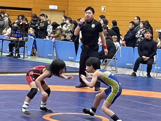 参加した地域のレスリングクラブは東京18クラブ、埼玉5クラブ、千葉6クラブ、神奈川4クラブ、茨木・福島各1クラブと関東一円にわたり、競技に参加した児童は3歳から小学6年生まで310人にも及びました。選手たちは、日ごろの練習の成果を懸命に発揮し、4面のコート一杯に所せましと技を競い合い、表情にも熱い闘志がみなぎり、観客席から大声援を受けていました。