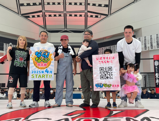 試合開始前に、宮古タクシー事業協同組合(代表理事 下地隆之)がプロジェクト代表を務める、「なら!なら?宮古島」の代表関係者がリングにて、ご挨拶と2025年4月開始に向けての広告主募集を呼びかけた。