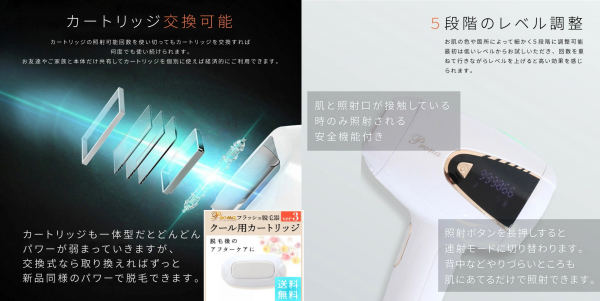 お肌の色や箇所によって細かく調整が可能。さらに、連射機能に加え誤照射防止の安全機能も搭載。初めての方にも安心してお使いいただけます。