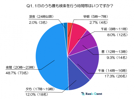 最も多かった回答は「夜間(20時〜23時)」で、約半数の48.7%がこの時間帯を選択しています。50代の方々にとっては、夕食や家事など一日の主要な用事を終えたあと、ゆっくり落ち着いて情報収集や検索を行う時間として夜間帯が活用されていることがうかがえます。