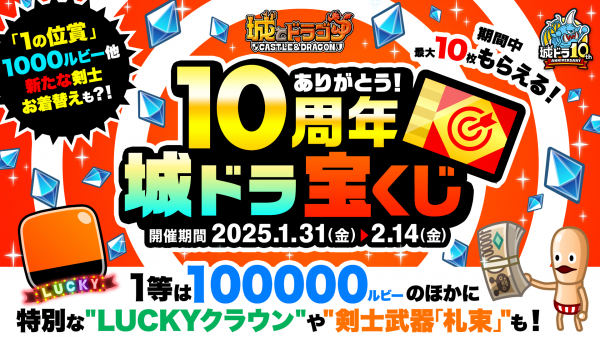 城ドラ最強運試し!「ありがとう10周年☆城ドラ宝くじ」が登場!「10周年記念ミッション」で入手できる「城ドラ宝くじ」には、1枚につき6桁の番号が書いてあります。1等で最高100,000ルビーが当たるほか、特別な“LUCKYクラウン”や、剣士の限定武器“札束”を。また、1の位賞当選者には1,000ルビーに加え、新・限定剣士お着替えを進呈!一部の当選が発表されるくじの抽選は、2月15月(土)の城ドラフェス会場にて実施予定です。