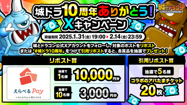 1月31日(金)より『城とドラゴン』10周年を記念した「城ドラ10周年ありがとう!Xキャンペーン」を開催いたします。『城とドラゴン』公式Xアカウント(@shirotodoragon)をフォローし、対象ポストをリポストまたは「#城ドラ10周年」をつけて引用リポストしていただいた方の中から抽選で、各賞に応じて「えらべるPay(R)」や、ゲーム内で2月の新キャラ「レジェンドドラゴン」などがラインナップされたアバたまに挑戦できるアイテム「コラボのアバたまチケット」をプレゼント!