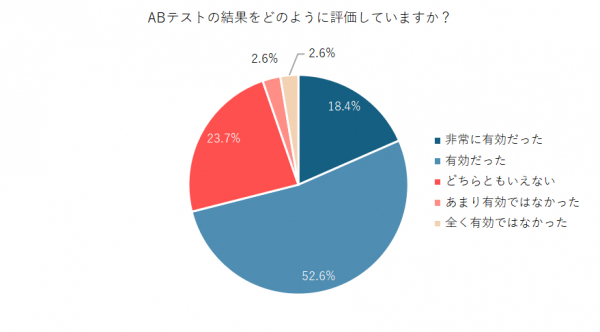 ABテストの結果をどのように評価しているかたずねたところ、「非常に有効だった」18.4%、「有効だった」52.6%、「どちらともいえない」23.7%、「あまり有効ではなかった」2.6%、「全く有効ではなかった」2.6%という結果に。過半数がABテストの効果を実感していることが明らかになりました。