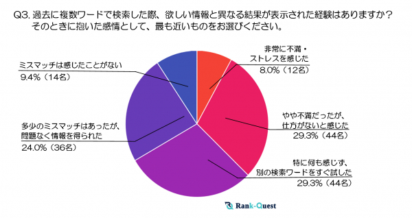 最も多かった回答は「やや不満だったが、仕方がないと感じた」と「特に何も感じず、別の検索ワードをすぐ試した」で、いずれも29.3%(44名)でした。これにより、全体の約6割が「ミスマッチに大きな不満を持たず、もしくはすぐに別の方法で対応する」という結果になり、複数ワード検索が大きなストレス要因になっていないことがわかります。