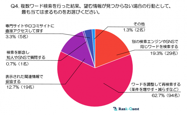 最も多かった回答は、「ワードを調整して再検索する(条件を増やす・減らすなど)」で62.7%(94名)がこの行動を選びました。検索結果が期待に沿わなかった場合、再度検索ワードを調整して、より正確な情報を探し直すという行動が非常に一般的であることがわかります。