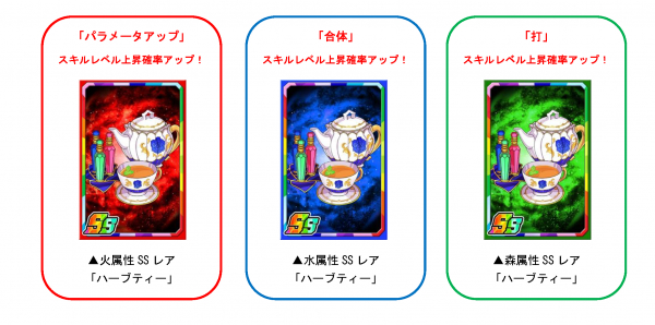 「フォレストP」を使い素材ガチャを回すと、限定の強化素材「ハーブティー」を手に入れることができます。一部のモンスターに使うと強化値2倍の効果があるほか、パラメータアップ・合体・打のスキルレベル上昇確率もアップします。
