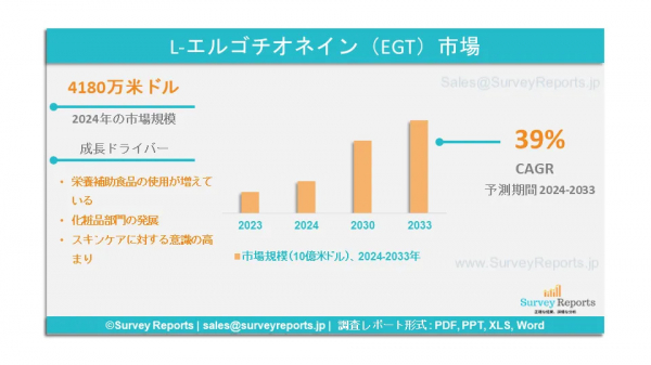 Surveyreportsの専門家はLエルゴチオネイン(EGT)市場調査を分析し、2024年に生成されたLエルゴチオネイン(EGT)市場規模は4180万米ドルであった。さらに、Lエルゴチオネイン(EGT)市場のシェアは、2033年末までに4億8970万米ドルの収益に達すると予測されている。Lエルゴチオネイン(EGT)市場は、2024年から2033年の予測期間にわたって、年間平均成長率(CAGR)約39%で成長すると予測されている。