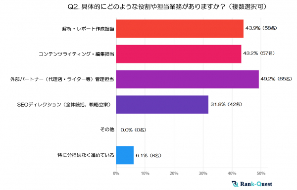 また、同時に「解析・レポート作成担当」や「コンテンツライティング・編集担当」も4割超と高い数値を示しており、SEOの成果測定やコンテンツ制作を社内で担うケースも少なくないことがわかります。