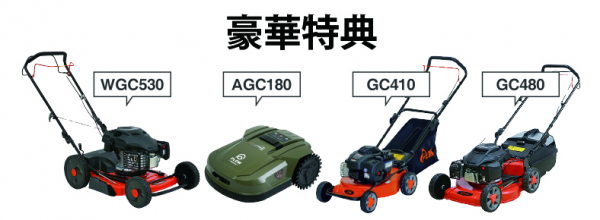 草刈機WGC530(¥69,800) 芝刈機GC410(¥44,800) 芝刈機GC480(¥69,800) ロボット芝刈機AGC180(¥54,800)