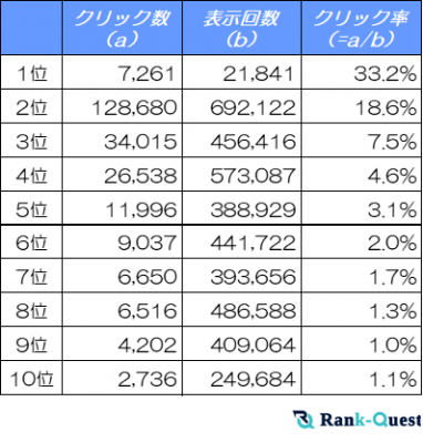 https://rank-quest.jp/column/column/how-to-seo/ 【SEO対策】で検索順位No.1を獲得した(注1)ランクエストが1〜10位の検索順位毎のクリック率を解説!