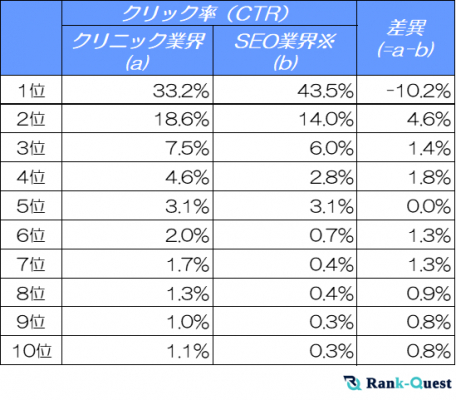 【SEO対策】で検索順位No.1を獲得した(注1)ランクエスト(https://rank-quest.jp/column/column/how-to-seo/ )は、2025年2月にクリニックのクライアントサイトを対象に、検索順位ごとのクリック率(CTR)を計測しました。