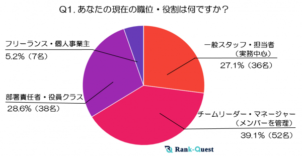 最も多かった回答は「チームリーダー・マネージャー(メンバーを管理)」で、全体の39.1%(52名)に上りました。続いて「部署責任者・役員クラス」が28.6%(38名)、「一般スタッフ・担当者(実務中心)」が27.1%(36名)となり、フリーランス・個人事業主は5.2%(7名)でした。