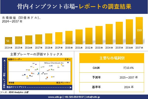 SDKI Analytics(本社:東京都渋谷区)は、このたび、2025年03月21に「骨内インプラント市場調査レポート:2025−2037年の市場規模、シェア、傾向の予測」を発表しました。骨内インプラントに関する市場調査レポートには、統計的および分析的アプローチを使用した予測評価が含まれています。この調査レポートでは、一次および二次調査方法を使用して分析された主要な業界洞察を通じて将来の傾向を理解できるようにすることで、主要な市場動向を読者に説明しています。