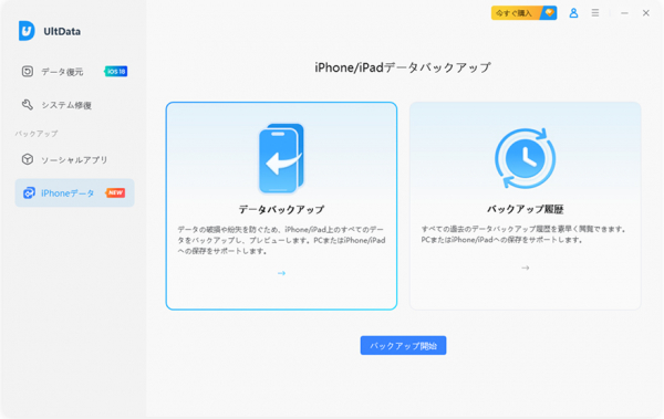 手順1.UltData for iOSをインストールして起動します。デバイスを接続し、「iPhone・iPadデータバックアップ」を選択します。
