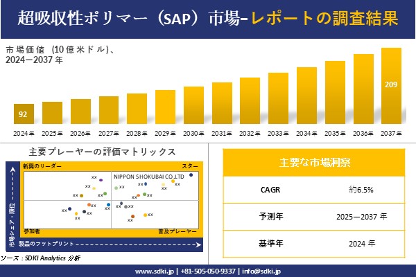 SDKI Analytics(本社:東京都渋谷区)は、このたび、2025年03月25に「超吸収性ポリマー(SAP)市場調査レポート:2025−2037年の市場規模、シェア、傾向の予測」を発表しました。超吸収性ポリマー(SAP)に関する市場調査レポートには、統計的および分析的アプローチを使用した予測評価が含まれています。この調査レポートでは、一次および二次調査方法を使用して分析された主要な業界洞察を通じて将来の傾向を理解できるようにすることで、主要な市場動向を読者に説明しています。