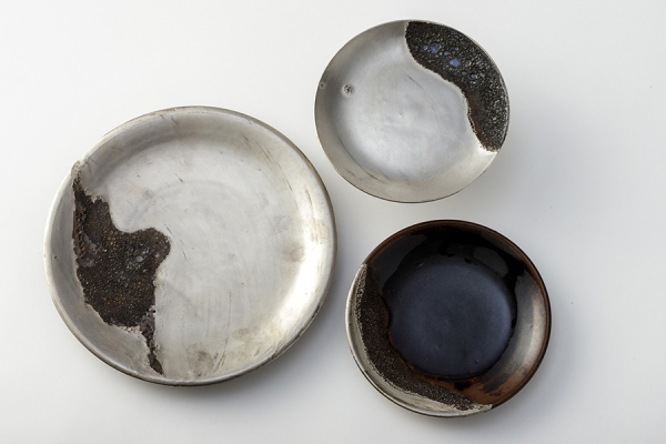 今回の特集では、?取 春慶さんによる、?取焼の黒い釉薬と銀彩の融合したもの、漆を施した作品を主軸に展開します。溶岩のような質感と、?取焼の釉薬と銀彩の特徴が三位一体となって、見るものを飽きさせない魅力的な商品展開となっています。