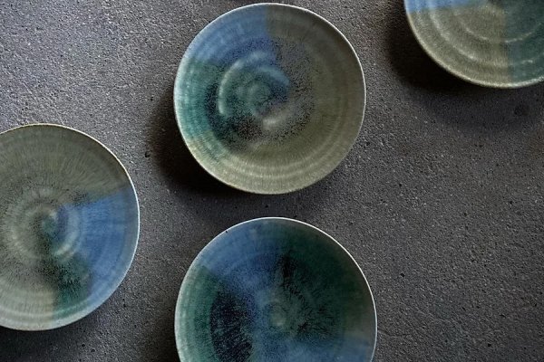 南窯の工藤 工さんによる「彩御深井(さいおふけ)」。美濃焼の指定15品目のひとつ「御深井」をベースに織部の緑、黄瀬戸の黄、瀬戸黒の黒、呉須の青など彩りを加えたシリーズ。
