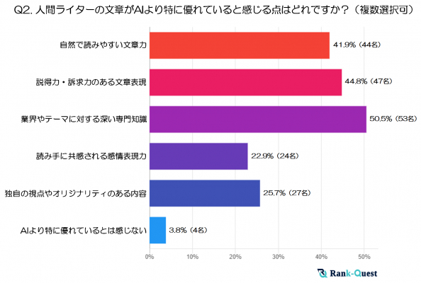 これらの結果からは、“専門領域ならではの知見”や“読者をしっかり惹きつける文章構成力”など、人間ライターの強みが際立っていることがうかがえます。