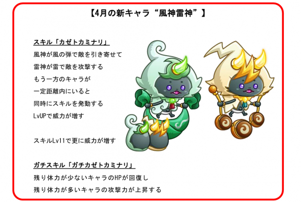 3月31日(金)19:00より、4月の新キャラ“風神雷神 (【CV】風神:守屋亨香/雷神:鷹村彩花) ”がアバたまに登場します。アカズキンやキンタロウに続く「2体で1つのキャラ」で、召喚すると画面の上下に分かれて進撃し、敵を翻弄します。登場を記念したログインボーナスでは、「フウライのアバたまチケット」最大5枚など豪華アイテムをプレゼント。また、ミッションクリアで「フウライのお着替え交換チケット」のほか、「専用ガチドラメダル」や「限定お着替え」などがもらえる「キャラミッション(風神雷神)」も開催します。さらに“風神雷神”を使用してクリアを目指す「討伐イベント」や、特定のキャラをリーダーに選択して“風神雷神”たちが占拠した城の奪還を目指す「レア城主」イベントなども同時開催。イベントに参加して、新キャラクターの登場をお祝いしましょう!