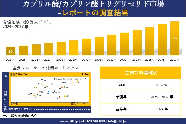 SDKI Analytics(本社:東京都渋谷区)は、このたび、2025年03月27に「カプリル酸/カプリン酸トリグリセリド市場調査レポート:2025−2037年の市場規模、シェア、傾向の予測」を発表しました。カプリル酸/カプリン酸トリグリセリドに関する市場調査レポートには、統計的および分析的アプローチを使用した予測評価が含まれています。この調査レポートでは、一次および二次調査方法を使用して分析された主要な業界洞察を通じて将来の傾向を理解できるようにすることで、主要な市場動向を読者に説明しています。