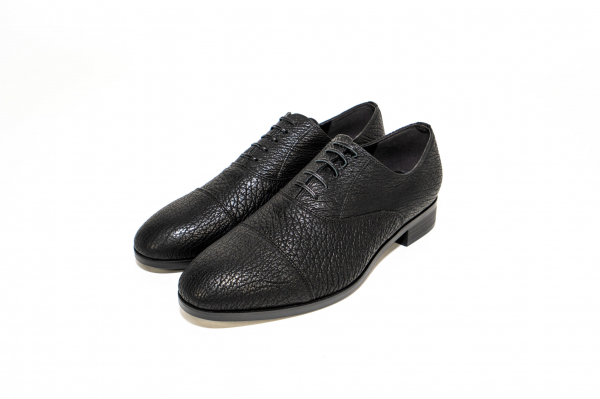 シャークレザーの力強さと深みを凝縮した漆黒の一足。無骨さと洗練が共存する、無駄を削ぎ落とした美の定番。