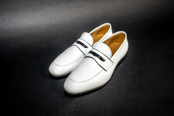 鮫革の繊細な模様と質感が際立つ純白の装い。清潔感と上品さが、旅にも日常にも映える一足。