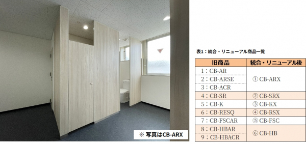 当社は現行のトイレブース【CB-AR、CB-ARSE、CB-ACR、CB-SR、CB-K、CB-RESQ、CB-FSCAR、CB-HBAR、CB-HBACR】9商品の形状を見直し6商品【CB-ARX、CB-SRX、CB-KX、CB-RSX、CB-FSC、CB-HB】へと統合、リニューアル販売します。(※表1参照)