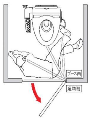 一般的にトイレのドアは内開きとなっておりますが、トイレ利用者がドア付近で倒れてしまった場合などは救出が困難になります。(※下画像イメージを参照)