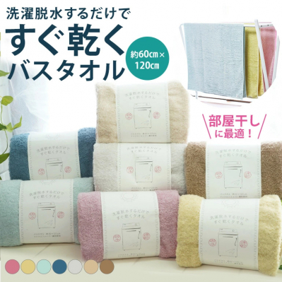 洗濯後の脱水だけで驚くほど早く乾くバスタオル。マイクロファイバー×コットンで吸水性と肌触りを両立。部屋干しにも最適な速乾タオルです。