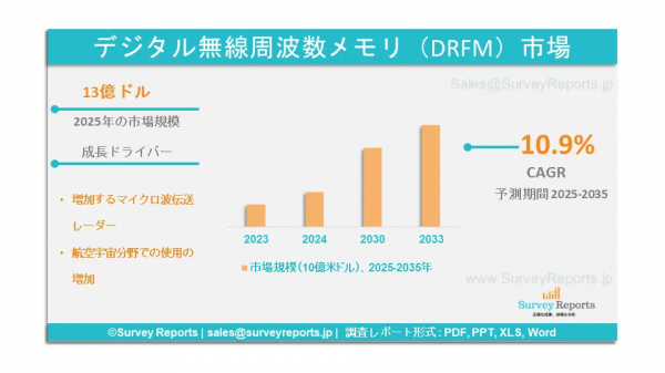 Survey Reports LLCは、2025年5月に「デジタル無線周波数メモリ(DRFM)市場セグメンテーション:アーキテクチャ別(コンバーター、プロセッサー、モジュレーター、その他);アプリケーション別(プラットフォームの電子保護、デジタルIFM、デジタル通信システム妨害、広帯域デジタル受信機、クロスアイ妨害)」というタイトルの研究報告書を発行しました。- グローバル市場分析、動向、機会、および予測(2025-2035年)は、デジタル無線周波数メモリ(DRFM)市場の予測評価を提供しています。この報告書では、デジタル無線周波数メモリ(DRFM)市場における主要な市場動向、成長要因、市場機会、課題、および脅威を強調しています。