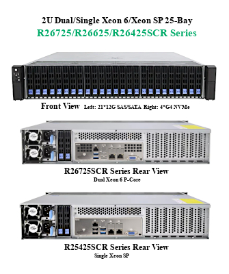 【2U ラックマウント, Dual Intel Xeon 6700P/6500P CPU, Intel SoC PCH, 21*2.5” 12G SAS/SATA +4*2.5” G4 PCIe NVMe可脱着ベイ, 5600/6400/8000 MT/s 3DS RDIMM(最大4TB)/ RDIMM(最大2TB)/ MRDIMM(最大1TB), 4*G5 PCIe/CXL2.0(X16)バス, 2*G5 PCIe/CXL2.0(X8)バス, 2*10GbE LAN, 1600W(1+1)CRPS 冗長化電源】