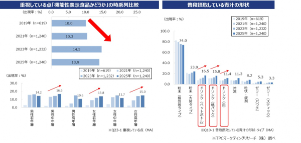◆青汁を選ぶ際に重視されている点の「機能性表示食品かどうか」の回答では、2025年は13.9%で、2019年と比較して3.9pt増加しており、青汁における機能性表示食品の需要が高まっている。また、「青汁に期待する健康効果」では、前回調査から「免疫力向上」が2.9pt、「疲労回復」は1.5pt増加しており、今後はこれらのヘルスクレームにおいて機能性表示食品としての需要の拡大が期待される。