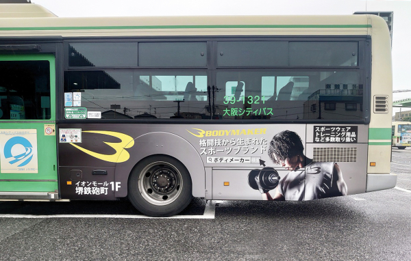 2025年6月13日(金)「BODYMAKER イオンモール堺鉄砲町店」のオープンイベントとして6月15日(日)から約6カ月の間、大阪市内を「ラッピングバス広告」が走ります。BODYMAKER は、商品開発から販売まで一環して行い、お客様へ高品質・リーズナブルな価格でスポーツ用品を提供しています。直営店舗「BODYMAKER イオンモール堺鉄砲町店」では、格闘用品、トレーニング用品、アパレル、シューズをはじめ、各種スポーツ用品を販売します。「ラッピングバス広告」は、公共交通機関を使った広告なので、信頼感が高く、企業やブランドのイメージアップにもつながり、特有の視覚的なインパクトで消費者に強く印象付けることが期待できます。走るラッピングバス広告をご覧になり、直営店舗「BODYMAKER イオンモール堺鉄砲町店」にぜひ、ご来店くださいませ。