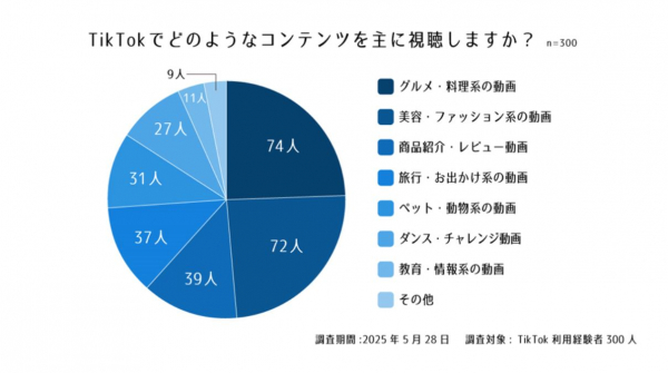 TikTokユーザーはグルメ・料理系と美容・ファッション系のコンテンツに高い関心を持っていることが明らかになりました。商品紹介・レビュー動画も一定のニーズがありますが、上位カテゴリと比較すると差があります。