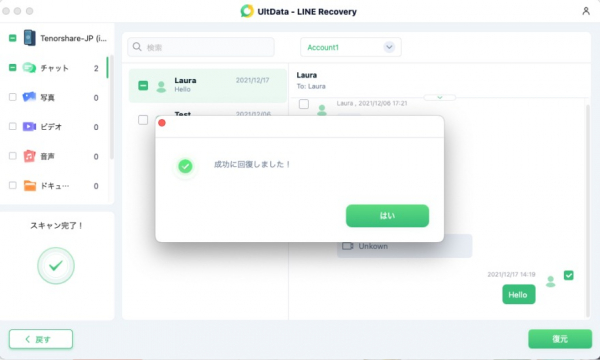 Tenorshare UltData LINE Recoveryはバックアップなしに、LINEトーク履歴・写真・動画などのデータを簡単に復元できるソフトです。