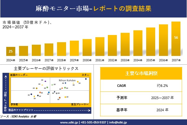 SDKI Analytics(本社:東京都渋谷区)は、このたび、2025年06月18に「麻酔モニター市場調査レポート:2025−2037年の市場規模、シェア、傾向の予測」を発表しました。麻酔モニターに関する市場調査レポートには、統計的および分析的アプローチを使用した予測評価が含まれています。この調査レポートでは、一次および二次調査方法を使用して分析された主要な業界洞察を通じて将来の傾向を理解できるようにすることで、主要な市場動向を読者に説明しています。