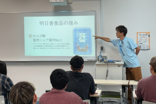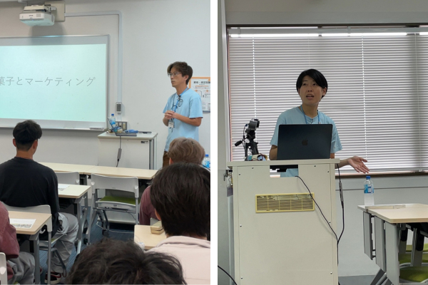 大阪府八尾市に本部キャンパスのある大阪経済法科大学が、同市の地元企業として明日香野に特別講義を依頼したことで実現。「和菓子とマーケティング」をテーマに、西日本事業部の鈴木敬太取締役、中野文子事業部長が講師を務めました。