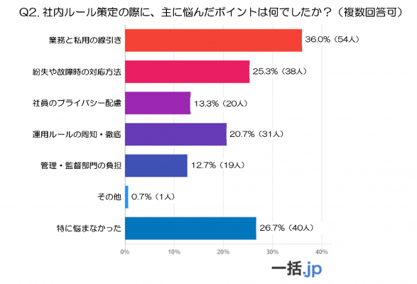 特に多くの企業が挙げた悩みは「業務と私用の線引き」であり、全体の36.0%(54人)が回答しました。業務目的の利用範囲を明確に定めることは重要ですが、現実的には明確に区別することが難しく、各企業が苦労している様子が見受けられます。