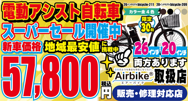 【大阪府摂津市】電動アシスト自転車「Airbike」取扱店〜サイクルショップTADA〜が6月21日(土)から販売を開始!驚愕の 1台 57,800円(税込)で新車購入出来るサマーセールも開催スタート♪