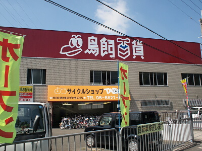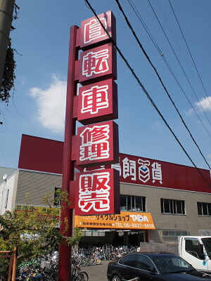 店舗の外観には、「自転車販売・修理」と書かれた赤い大きな看板が目印!