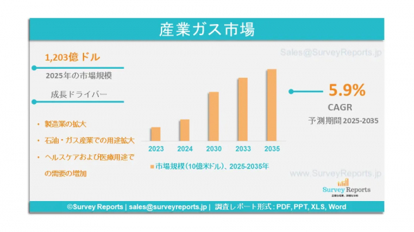 Survey Reports LLCは、2025年6月に「産業用ガス市場セグメンテーション:製品別(窒素、水素、二酸化炭素、酸素、アルゴン、アセチレン)、用途別(医療、製造、金属・ガラス、食品・飲料、小売、化学・エネルギー、その他)」に関する調査報告書を発行しました。供給形態別(オンサイト、バルク(液体ガス輸送)、シリンダー(商用品));製品タイプ別(大気ガス、プロセスガス、その他); 技術別(低温空気分離、膜分離、圧力スイング吸着(PSA)、蒸気メタン改質);企業規模別(中小企業(SME)、大企業);最終ユーザー別(産業、輸送、農業、エネルギー、製造、化学加工、金属加工、その他); - 2025年から2035年までのグローバル市場分析、動向、機会、予測。産業用ガス市場の予測評価を提供します。産業用ガス市場における成長要因、市場機会、課題、脅威など、複数の主要な市場動向を強調しています。