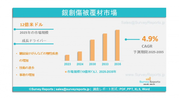Survey Reports LLCは、2025年6月に「銀含有創傷被覆材市場セグメンテーション(製品別(伝統的(銀含有包帯、その他)、先進的(銀含有フォーム被覆材、銀メッキナイロン繊維被覆材、銀含有ハイドロゲル/ハイドロファイバー、銀アルギン酸塩、ナノ結晶銀被覆材、その他))」に関する調査報告書を発行しました。用途別(慢性創傷(糖尿病性足潰瘍、褥瘡(ステージ1、ステージ2、ステージ3、ステージ4)、静脈性下肢潰瘍、その他の慢性創傷)、急性創傷(手術・外傷性創傷(皮膚裂傷を含む)、火傷(1度火傷、2度火傷)); 流通チャネル別(オンライン、オフライン);最終用途別(病院、クリニック、在宅医療、その他);素材別(フォーム、ハイドロゲル、アルギン酸、キトサン、コラーゲン);技術別(負圧創傷療法、抗菌ドレッシング、高度創傷ケアドレッシング); 形態別(シート、包帯、粉末、ゲル、軟膏);高度製品別(銀フォームドレッシング、銀メッキナイロン繊維ドレッシング、銀ハイドロゲル/ハイドロファイバー、銀アルギン酸塩、ナノ結晶銀ドレッシング、その他); 疾患別(やけど、潰瘍、切り傷・裂傷、その他の創傷タイプ) - グローバル市場分析、動向、機会、予測(2025-2035)は、銀含有創傷被覆材市場の予測評価を提供します。本レポートでは、銀含有創傷被覆材市場の成長要因、市場機会、課題、脅威を含む主要な市場動向を強調しています。