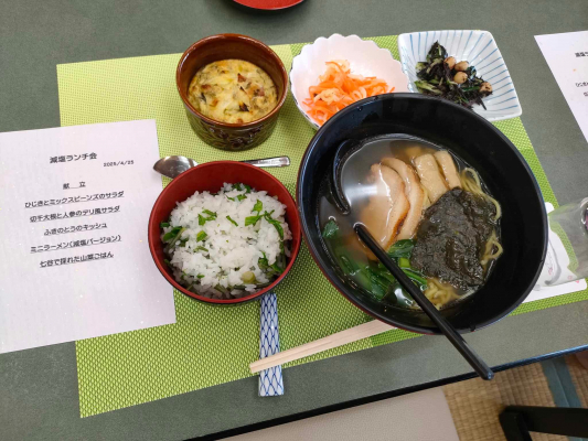 加茂市七谷の温泉施設「美人の湯」にて、地域で2回目となる減塩ランチ会を開催いたしました。全国的に塩分摂取量が多い現状を受けて、食生活の改善と地域全体の健康意識の向上を目的とし、当社栄養士兼料理家の文の監修の元、市内飲食店と連携し実施しております。今回会場となった美人の湯「ななたに食堂」のスタッフ方々による地域の食材を使用した減塩メニューとともに、食堂の人気メニューの醤油ラーメンを減塩化して提供いたしました。参加者からも「普段と変わらない美味しさで健康にも配慮されていて嬉しい」と、喜びの声が上がっており大盛況のイベントとなりました。また、これまでの開催を通じて、参加飲食店の一部では実際に減塩メニューの定番化を検討するなど、食の現場からも地域全体の健康づくりが動き始めています。今後も、「食」と「運動」に着目し、健康寿命の延伸と地域の活性化を図る取り組みを継続してまいります。