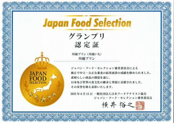 この度、川越プリンは『川越プリン(川越いも)』が、ジャパンフードセレクションにて埼玉県初となるプリンでのグランプリを受賞致しました。